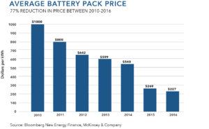 Both public and private sector research efforts have resulted in significant increases in battery efficiency. According to Bloomberg New Energy Finance, the average battery pack price across the industry has decreased from around $1,000/kWh in 2010 to $227/kWh in 2016, a 77 percent decline. These costs are projected to decline even further to $190/kWh by the end of the decade, and below $100 per kWh by 2030.